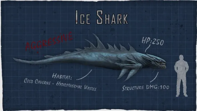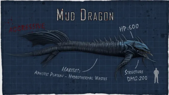 Встречается от Холодных пещер до Гидротермальных Пустошей.Грязевой дракон: Опасный одиночный хищник, способный разрушить корпус субмарины. Шансы на выживание при встрече с ним вне субмарины минимальны.