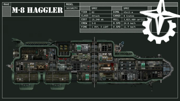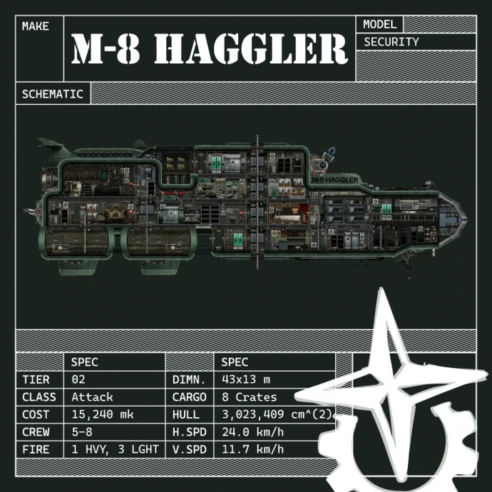 Сочетая внушительный вид и боевую мощь, M-8 Haggler представляет собой ударную подлодку, изначально созданную для флота Коалиции. Несмотря на то что её вытеснили субмарины с более «экономичной» компоновкой, наёмники ценят классический, функциональный и устрашающий силуэт «Haggler», за который менеджеры аванпостов готовы доплачивать – будь то защита важных объектов или уничтожение локальных стай молотоголовых.