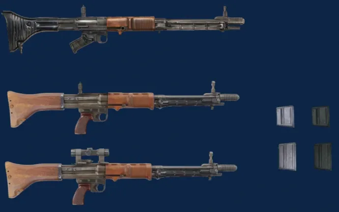 - FG-42 (ранняя и поздняя модели): урон – 95, скорострельность – 700/900 выстр./мин, магазин – 10/20 патронов, стоимость – 6800/8400/9800 марок, точность от средней до очень высокой. Редкое и мощное оружие.