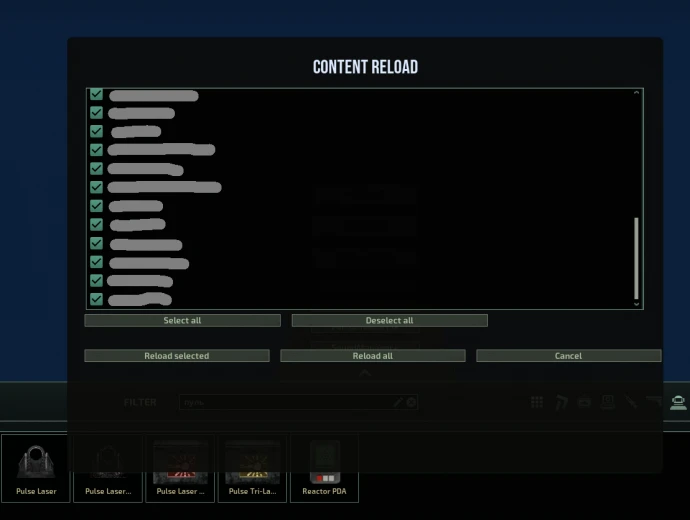 Добавляет кнопку в меню паузы (ESC) для перезагрузки выбранных или всех активных модов. Выполняет повторное чтение filelist.xml и контента. Работает только в одиночном режиме. Инстансы миров из перезапущенных модов удаляются; определения префабов обновляются для новых появлений.