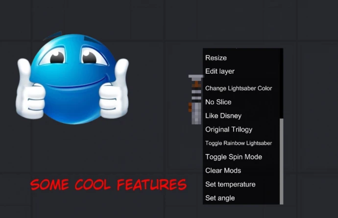 Исправлены ошибки предыдущих версий: синхронизация радужного режима для всех клинков, улучшено поведение при захвате и сбросе, доработаны столкновения мечей. Через контекстное меню правой кнопкой мыши доступны функции изменения цвета светового меча, включения режима радуги, режима вращения и выбора типа рассечения.