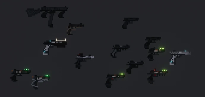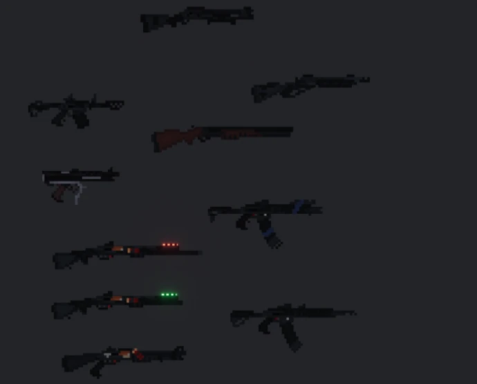 - Детализация оружия: Реализованы подвижные части (затворы, рукояти взведения, крышки ствольной коробки, прицелы). У пистолетов есть кожухи затворов, у некоторых винтовок – фиксаторы затвора. Прозрачные магазины визуально отображают количество патронов.