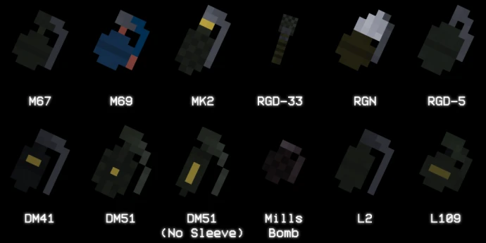 Мод добавляет в игру новые гранаты с различными свойствами, внешним видом и названиями, сохраняя стиль оригинальной игры.