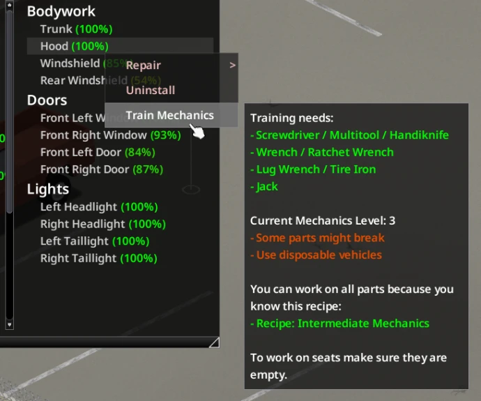 Мод «Better Auto Mechanics [B42.13.1 MP+SP]» для Project Zomboid – это улучшение механики прокачки навыка механика. Позволяет тренировать механика одним кликом. Работает в одиночной и многопользовательской игре.