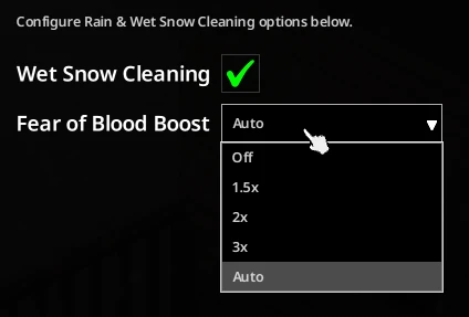 - Общие: Включение очистки мокрым снегом; множитель скорости умывания для черты «Боязнь крови» (выкл, 1.5x, 2x, 3x, авто).