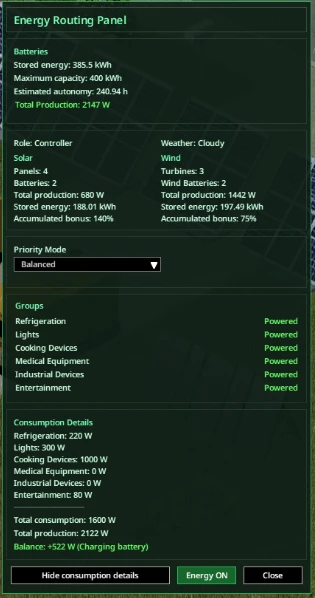 - Отдельные панели статуса для аккумуляторов, турбин и солнечных панелей.