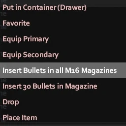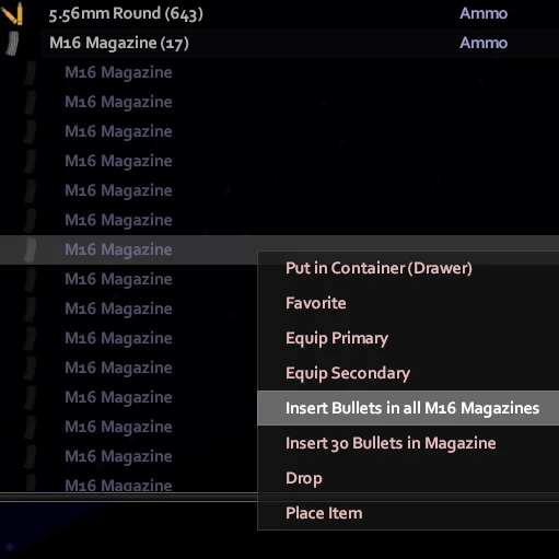 Добавляет опцию в контекстное меню правой кнопки мыши для заряжания/разряжания всех магазинов выбранного типа. Не влияет на перезарядку через радиальное меню.