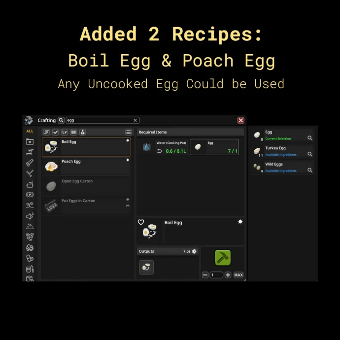 Мод добавляет в систему приготовления пищи рецепты варёных яиц. Теперь можно готовить яйца в кипящей воде, получая яйцо пашот и варёное яйцо.