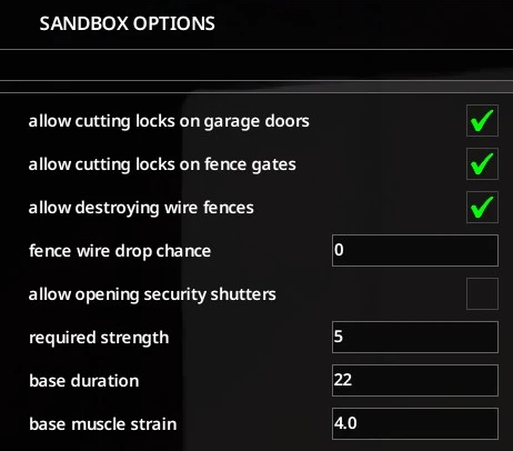 - Настройки песочницы для включения отдельных функций: срезание замков с гаражных ворот, ворот забора и защитных ставней, а также разрушение секций проволочного забора.