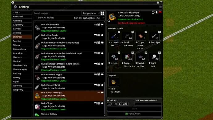 Мод Solar Floodlight добавляет в Project Zomboid автономное уличное освещение для версии Build 42. Устройство работает от реальной перезаряжаемой батареи, заряжается днем и освещает базу ночью. Подходит для убежищ, мастерских, входов, дворов и удаленных форпостов.