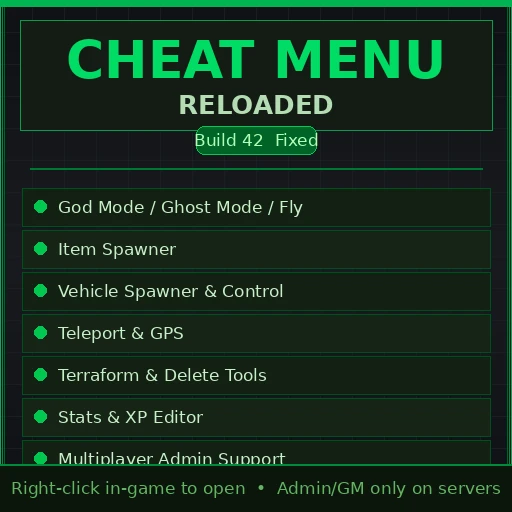 Cheat Menu: Reloaded [B42 Fixed] для Project Zomboid – универсальный чит-меню и административный инструмент для сборки 42, полностью работающий в одиночной игре, кооперативе и на выделенных серверах. Мод представляет собой переработанную и исправленную версию оригинальной серии Cheat Menu: Reloaded / Cheat Menu Phoenix для версии B42.15 и выше.