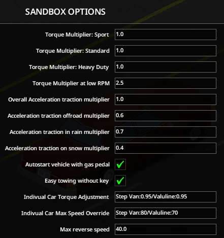 – Настройка мощности и максимальной скорости для каждого автомобиля в песочнице.