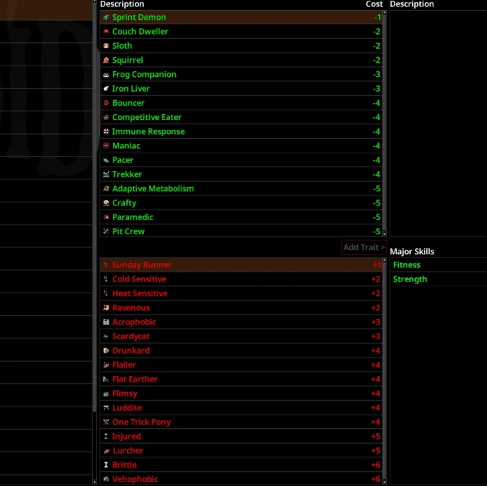 Мод добавляет 16 положительных и 16 отрицательных черт, а также расширяет 14 стандартных черт (опционально доступен модуль «бонус к навыку»). Информация актуальна для последней версии игры. Мод ориентирован на мультиплеер, но корректно работает в одиночной игре. Он рассчитан на сложные настройки: высокая популяция зомби, выносливые зомби, спринтеры и точное прицеливание.