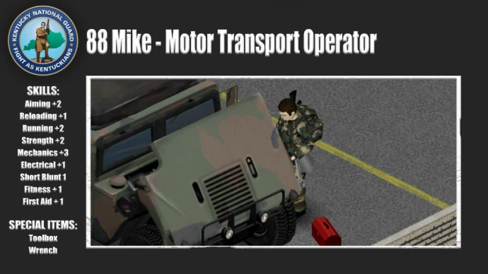 Мод добавляет пять исторически достоверных профессий, основанных на подразделениях и снаряжении Национальной гвардии Кентукки, которые реалистично могли быть задействованы во время операции в зоне отчуждения Нокс в 1993 году. Каждая профессия имеет соответствующее снаряжение с реалистичным количеством боеприпасов, пайков и полевого оборудования, сбалансированное и соответствующее эпохе.
