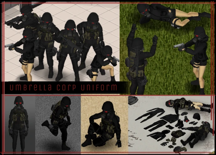 Мод добавляет форму корпорации Umbrella. Предметы можно получить путем крафта или найти на зараженных вблизи военных и общих зон с настраиваемой частотой появления.
