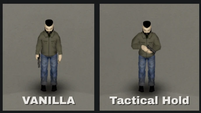 Мод изменяет анимацию удержания пистолетов игроком на более тактический стиль. Предназначен для пользователей, которых не устраивают стандартные анимации и которые готовы мириться с возможными несоответствиями.