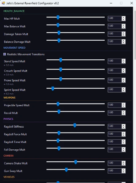 - Оружие: Множители скорости снарядов и базовой отдачи.