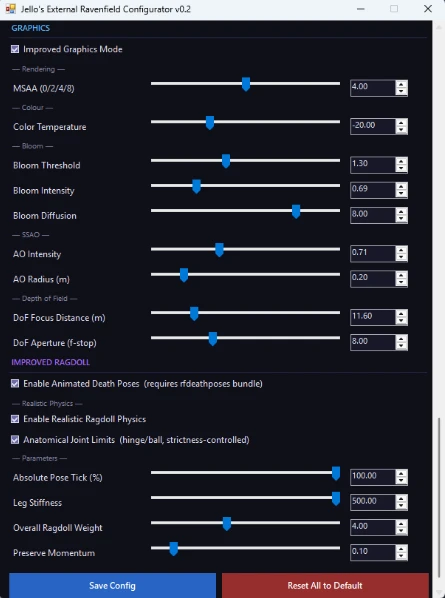 - Настройки: сила позы смерти, жесткость ног, вес ragdoll, сохранение инерции.