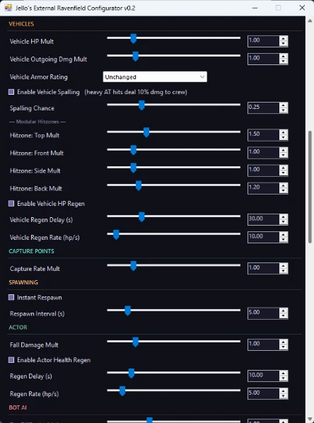 - Контрольные точки и возрождение: Множители скорости захвата и интервала возрождения, опция мгновенного возрождения.
