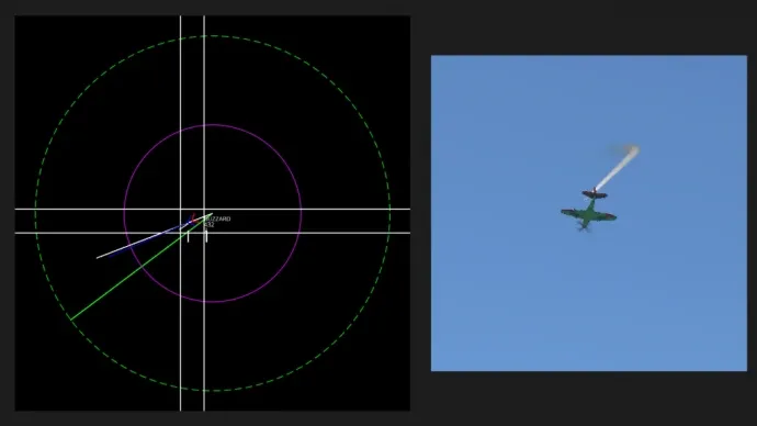 - Справа от каждой цели отображаются название, дальность (в метрах) и высота (в сотнях футов).