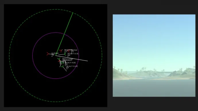 - Левый экран – дисплей радара: зелёная метка обозначает дружественную цель, красная – вражескую, серая – нейтральную.