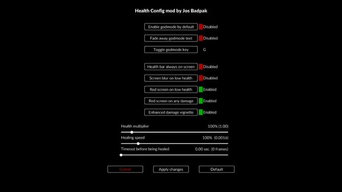 Мод позволяет изменять сложность игры и настраивать визуальные эффекты, связанные со здоровьем. Скорость ходьбы всегда остается нормальной независимо от уровня здоровья, остальные параметры можно изменить в меню настроек мода.