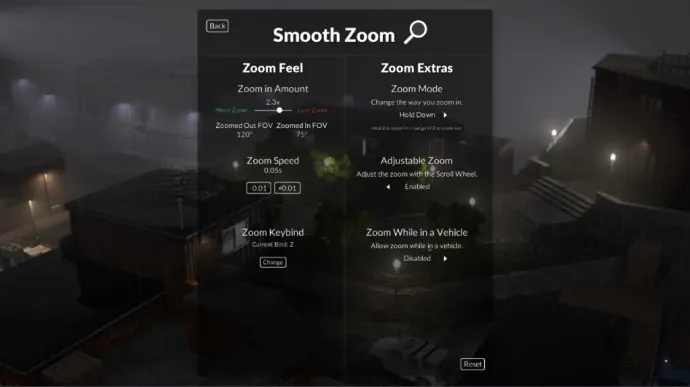 Привязки клавиш, скорость и степень приближения можно изменить в настройках мода. Если зум работает некорректно или слишком медленно, рекомендуется сбросить настройки мода до значений по умолчанию.